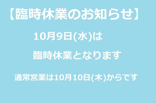 【10月9日(水) 臨時休業のお知らせ】 2024.10.03 誠に勝手ながら、社員研修のため、10月9日(水曜日)は臨時休業とさせていただきます。ご不便をおかけいたしますが、何卒ご理解のほどよろしくお願いいたします。 なお、10月10日(木曜日)より通常営業いたします。